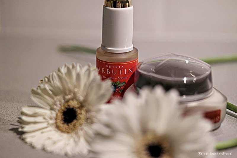 Nyt reilun kuukauden päivät olen testaillut blogin kautta saamiani Detria Arbutin - tuotteita. Sain testattavakseni sarjan yö- ja päivävoiteet, seerumin sekä silmänympärysgeelin. Edellisen postaukseni tuotteista löydät tästä klik. Tuotteet on tarkoitettu erityisesti couperosa- ihon hoitoon sekä pigmenttierojen tasoittamiseen. Omalla ihollani on havaittavissa paikoitellen couperosaa, joten mielenkiinnolla olen testaillut näitä tuotteita . Näistä tuotteista erityisesti yövoide on lumonnut minut. Siitä on nimittäin vuosia aikaa, kun olen käyttänyt erillistä yövoidetta. Nyt, kun olen joka ilta säännöllisesti muistanut laittaa ensin muutaman tipan seerumia kasvoilleni ja sen jälkeen täyteläisen kosteuttavaa yövoidetta, huomaan ettei iho huuda heti aamusta kosteutusta. Yövoide imeytyy hyvin ainakin omalle iholleni ja ihosta tulee samettinen. Välillä kiireessä, olen unohtanut koko päivävoiteen sillä täällä on kyllä viime aikoina menty kiireessä meikittä. Hieman kaipaan ripispidennyksiä, että näyttäisi ihmiselle taas. No mutta paras lopputulos tietysti saavutetaan, kun muistaa käyttää kaikkia tuotteita, eli siinä on hieman minulla petrattavaa.
