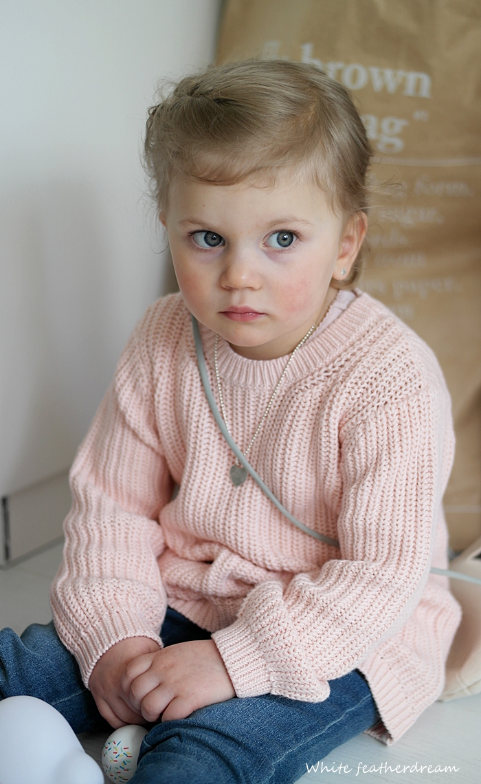 Keskimmäiselle valitsin puuvillaneuleen ja farkut. Koko molemmissa on 104, eli vielä reilut. Housuissa on onneksi kiristysmahdollisuus, muuten ne tippuisivat vielä neidin päältä. Tyttöjen valikoimassa erityisesti olisi ollut vaikka mitä herkkuja, mutta neiti on niin kovin tarkka vaatteistaan tällä hetkellä, että valitsin " varmat " hänen makuunsa.
