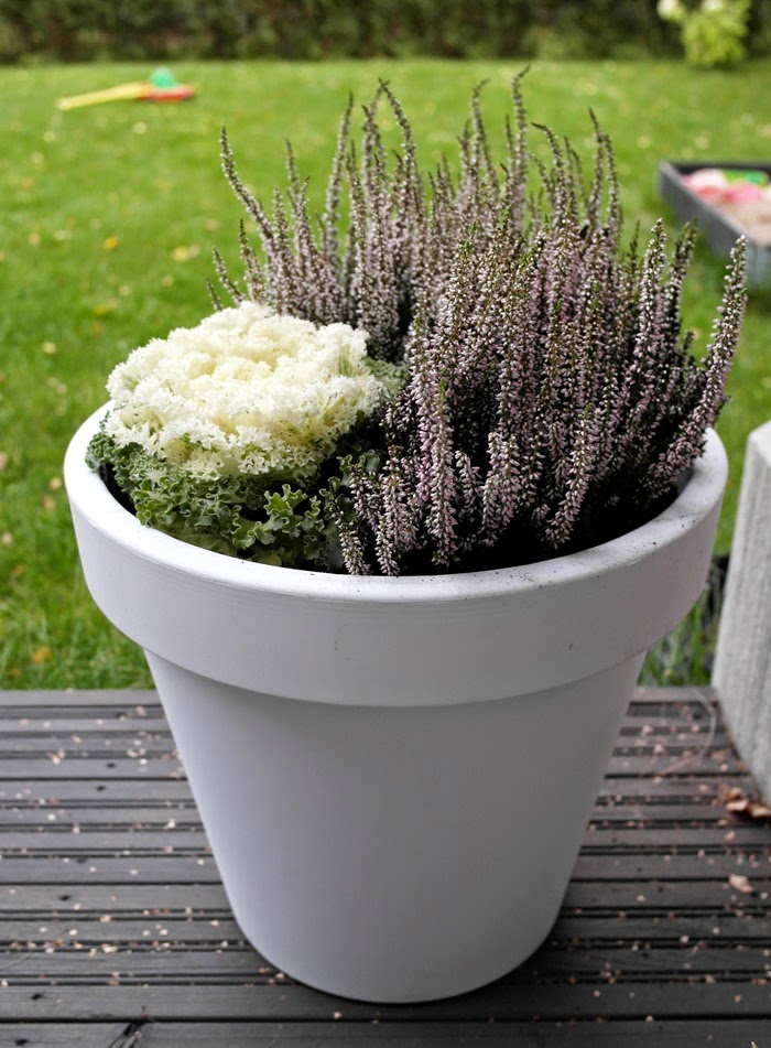 " Pihaummikkona " ajattelin tietysti löytäväni sellaisen helposti, mutta ehei. Sesonki niiden kohdalta on kuulemma täysin ohitse. Kiersimme useita puutarhamyymälöitä ja soittelin muutamiin paikkoihin. Sopivaa ei vaan löytynyt. Tuo valkoinen ruukku saa nyt kelvata tämän syksyn / talven ja se löytyi lopulta Tarjoustalosta. Muovisella ruukulla hintaa huimat 5 euroa. Ainakin sain kukat istutettua ja ensi keväänä osaan hankkia ruukut ajoissa.