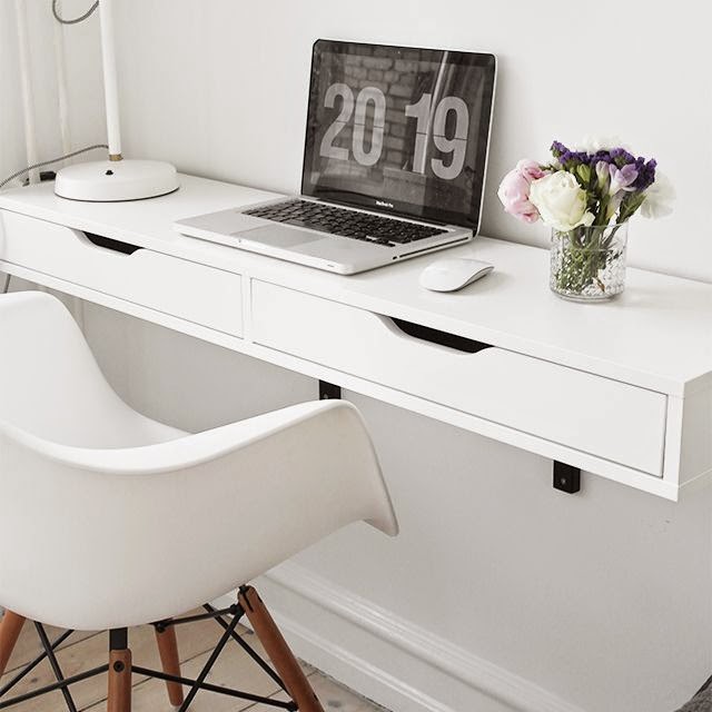 Yläkertaamme on siis tulossa mm. työtila ja poimin tähän muutamia inspiraatiokuvia tunnelmasta jota sinne haluan. Värimaailma tulee sielläkin olemaan valkoista, vaaleanharmaata & ripaus mustaa. Kalkkimaalia, jolla maalasin makuuhuoneemme seinän on vielä yksi pussi jäljellä, joten tarkoitus on maalata yksi seinä sillä yläkerrassa. Työpöytä saa DIY- muutoksen ( kunhan sekin ennätetään vaan tehdä ) ja työtuolina toimii ainakin alkuun Eames. Yläkertaan siirtyy olohuoneemme matto, sillä ensi viikolla meille saapuu uusi matto JIPPII ! Siitä lisää, kunhan saamme sen.