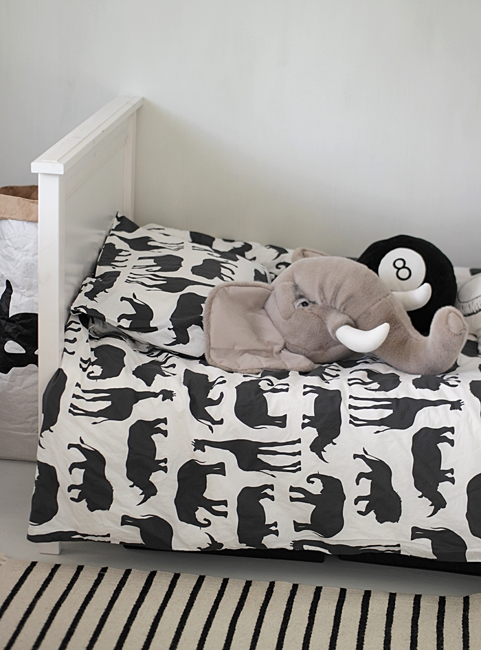 Pojan huone on taas edistynyt, mutta kesken se vielä on ja kuten näkyy norsunpää on yhä kiinnittämättä seinään. Lupasin pojalle, että se on seinässä kun hän palaa. Onneksi on vielä aikaa toteuttaa pojan toive. Tuo norsunpää, jonka hän sai vajaa kolme vuotta sitten joululahjaksi on hänelle niin tärkeä. Se on hankittu Ombrellinosta. Pitäisi mitata norsulle vain oikea paikka seinästä. Päätimme sittenkin pitää vielä vanhan sängyn, sillä jatkettavassa sängyssä on se hyvä puoli, että se vie vähemmän tilaa. 5-vuotias minipoikamme mahtuu vielä hyvän aikaa nukkua tuossa sängyssä. Huoneen värimaailma on pojan toiveen mukaan mustan, valkoisen ja harmaan sekoitus. Maalasimme uudelleen kalkkimaalilla tuon päätyseinän. Olin jo kyllästynyt vanhaan Winter Primo - sävyyn, joka näytti pojan kalusteilla tunkkaiselle ja toisaalta vajaassa kolmessa vuodessa seinä oli ehtinyt likaantua. Halusin seinästä vaaleamman harmaan ja päädyin Kalklitiirin uuteen Carrera sävyyn. Maali on ostettu Nougatista. Vähän jännitti miten vanha paljon tummempi sävy saadaan peittoon, mutta kyllä se sinne vaan katosi muutamalla maalikerroksella. Tykkään todella paljon uudesta raikkaammasta sävystä  ja vielä kun pää saadaan seinälle kiinnitettyä.