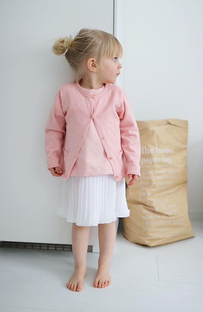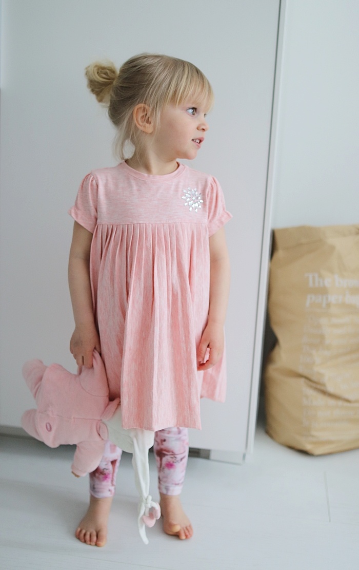 Kevättä ja tulevaa kesää fiilistellen ajattelin esitellä teillä vähän POP&Co:n -vaatteita. POP&Co on uusi suomalainen lastenvaatebrändi, jonka takana on suunnittelija Petra Kiuru. Petra on pitkään ollut mukana lastenmuodin parissa ja halusi luoda nyt oman näköisen malliston täydellisenä vastakohtana massatuotannolle, jossa näkyisi vahvasti oma kädenjälki ja tyyli. Inspiraatio ensimmäiseen mallistoon on tullut Andalusian kirkkaista väreistä ja Pariisin kesäaamujen utuisista sävyistä. Suunnittelussa hän tutkii koko ajan mahdollisuuksia käyttää yhä enemmän ekologisia ja kierrätettyjä materiaaleja. Malliston vaatteet on suunniteltu niin, että niitä on helppo yhdistellä arjessa toisiinsa ja ennen kaikkea ne ovat mukavia lapsen päällä. Malliston omat suosikkini ovat ehdottomasti ylimmän kuvan vaaleanpunaiset - ja valkoiset legginsit, jotka kimaltavat kauniisti sekä vaaleanharmaa t-paita, jossa on takana valkoinen helma. Asun viimeistee neuletakki, jossa on ruusukullan sävyiset napit. Niin herkkuja ovat tyttöjen mekotkin vaaleanpunaisena ja keltaisena. Isommalla neidillä oli itsellään heti visio ja hän halusi ehdottomasti yhdistää mekkoon farkkutakin  ( takki ei ole POP&Co:n mallistoa ).