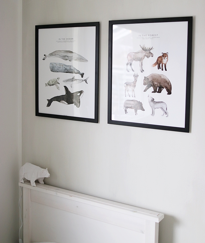 Pitkästä aikaa kuvia pojan huoneesta, johon olen tehnyt alkuvuodesta pientä freesausta. Pieni poikani täyttää pian seitsemän vuotta ja aloittaa syksyllä koulun. Niisk , joten jo sitä silmällä pitäen halusin huoneesta viihtyisämmän. Muutokset kun piristävät aina. Poika rakastaa eläimiä ja toivoi niitä lisää, muuten sain vapaat kädet. Olin tilannut hänelle joululahjaksi muutaman suloisen eläinjulisteen täältä poikani maun tuntien. Julisteet löysivät paikkansa sängyn päältä. Mustat kehykset on hankittu Ikeasta ja niissä on muovinen pleksi, eli turvallisia käyttää lastenhuoneessa. Sängyn päädyssä toimii yövalona  Jollyroomista saatu kaunis origami pöytävalaisin. Poika valitsi itselleen valkoisen karhun, vaihtoehtoja oli muitakin. Valaisimessa on todella kaunis lämmin valo ja se tuo kivaa tunnelmaa huoneeseen hämärällä. Valaisimeen liittyen on tulossa arvonta ja sitä varten otan kuvia kun valo on päällä.